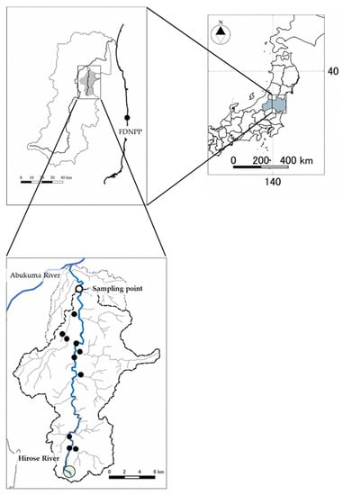 This study was conducted in the Hirose River catchment, which is located approximately 40–60 km from the FDNPP in the northern part of Fukushima Prefecture, Japan (Figure 1).