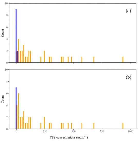Distribution of TSS concentrations in river water samples under base- (blue) and high-flow (orange) conditions. (a) Raw data; (b) Redefined data based on the median of raw data collected under base-flow conditions.