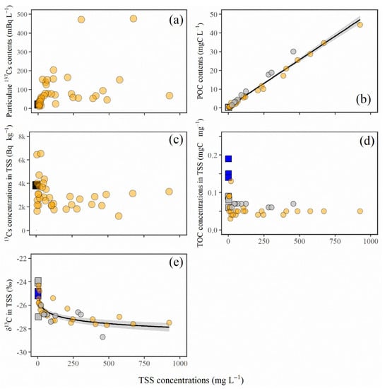 Changes in particulate 137Cs, POC, 137Cs, TOC, and δ13C with increasing TSS concentration. The average value and standard deviation under the base-TSS-load conditions (black squares) and all of the data measured under high-TSS-load conditions (orange circles) are shown. For POC, TOC, and δ13C, measured and estimated values are shown separately for each of the river conditions (gray for estimated and blue and orange for measured values, and squares for the base- and circles for the high-TSS-load conditions). (a) Particulate 137Cs content; (b) POC content; (c) 137Cs concentration; (d) TOC concentration; and (e) δ13C values in TSS. The shaded areas represent the 95% confidence intervals.