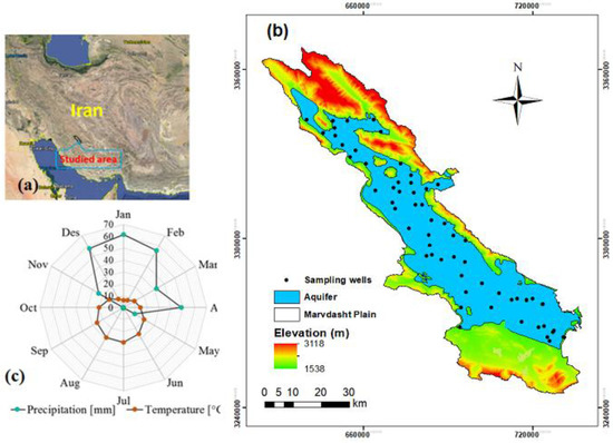 Location of study area in the Marvdasht plain (UTM), northeast Fars province in Iran (a), distribution of sample points (b) and average monthly precipitation and temperature (from 2001 to 2018) (c).