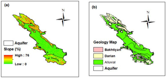 The altitude of the study area varies in the range of 1500–2460 m with a mean of 2070 m above sea level [2,3]. The slope of the study site varies from 0 in the central parts of the site to 76% in the mountainous regions, which are found mainly in the north of the study site. As shown in Figure 2a, the Marvdasht aquifer extends into the flat parts, having less than 10% slope. As presented in Figure 2b, the studied aquifer is located in the alluvial formation, covering from north to south of the site. Bakhtiyari and Hormuz [1,2], which have high amount of calcium carbonate, are the typical geological formations in the study site [29]. The center of the study area is a flat plain with intensive agricultural activities, while the elevated zones of the study area are predominantly mountainous [29].