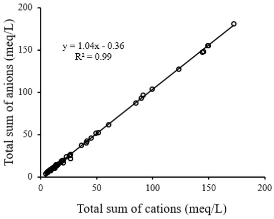 A CBE < 5% indicates the data are acceptable for analysis [6]. A CBE of 1.3% proves the high accuracy of chemical analysis of groundwater quality parameters [6]. Figure 3 supports Equation (3) by presenting a perfect relationship between the total sum of cations and anions (meq/L) for all 70 groundwater samples. The hydro-chemical analysis was carried out in Aqua software.