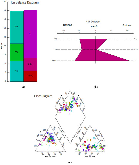 Ion balance (a), Stiff (b), and Piper (c) diagrams of the Marvdasht groundwater.