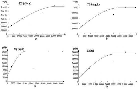 Figure 5 shows the best-fitted variograms of DGWQI and the parameters of EC, TDS, and Mg2+ that had the highest influence on DGWQI. For DGWQI, EC, TDS, and Mg2+, the variogram spherical model had the best performance, which could be due to the high correlation between DGWQI and EC, TDS, and Mg2+. In Arsanjan groundwater, the spherical model was the best model for TDS and pH.