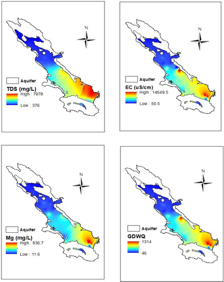 The estimated maps for all DGWQI, EC, TDS, and Mg2+ by applying the OK method are depicted in Figure 6. Spatial variations of all DGWQI, EC, TDS, and Mg2+ had the same trend; enhancing from the northeast to the southwest of the aquifer. TDS values ranged from 376 mg/L in the northern parts to 7979 mg/L in the southern parts of the aquifer. In the northwestern parts, the amount of TDS and EC was lower than the WHO standard for drinking, but by moving to the south of the aquifer, the quality of groundwater in terms of TDS and EC decreased and groundwater became unsuitable for drinking according to WHO (2011). The EC value varied from 50.5 μS/cm in the northern parts to 14,649.5 μS/cm in the southern parts of the aquifer. The DGWQI value varied from 46 in the northern to 1314 in the southern parts of the aquifer. Therefore, groundwater quality was appropriate in the northern parts and unsuitable for drinking in the southern parts [32]. Geological formations in the northern and central parts of the plain are alluvial and Sarvak limestone (Figure 2b), which are very compact, hard, and low solubility [4,48]. The Dorodzan dam located in the northern part of the site charges the groundwater of this area. While in the southeast, the presence of Sarvestan sediments (gypsum-saline) and Hormoz igneous rocks can lead to a decrease in groundwater quality [29,49]. Furthermore, in this area, gypsum-marl formations containing gray lime and dolomite calcium and magnesium carbonate along with evaporitic sediments reduce groundwater quality [29,50]. Therefore, EC, TDS, Mg2+, and then the DGWQI in the southeastern parts of Marvdasht aquifer were high. In addition to geological reasons, the recharging the aquifer by the Kor River is another reason for the low quality of groundwater in the southern part. Furthermore, the entry of industrial, municipal, and agricultural wastewater reduces the quality of the Kor River, which ultimately reduces the quality of groundwater in the southeastern part of the aquifer, which charges the Marvdasht aquifer, resulting in a decrease of groundwater quality in that part of the site. In addition, as mentioned, the groundwater flows from high altitude in the north to the altitude in the south, where there are high amounts of salt and carbonates, causing lower groundwater quality.