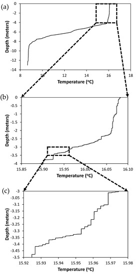As the mm-resolution of the raw profiles was only approximate, the truncated profiles were then interpolated to exactly 1 mm-depth resolution using an inverse distance-weighted mean of all recorded temperature data within 5 mm of each point on the 1 mm-resolution scale. To remove noise from the data, and thus prevent false identification of turbulent overturns, the de-noising method of [34] was then applied to each profile, following [19]. In the original version of this method, the noise threshold is defined in terms of the density. Since the data used here was temperature data, the density threshold needed to be converted to a temperature threshold. However, in standard practice, density is calculated from temperature using a fifth order polynomial [35] and inversion of fifth order polynomials is intractable. To convert the previously-used density noise threshold to a temperature noise threshold, therefore, a linear fit of the density-temperature relationship in the range 8–22 °C (where all of our temperature data lay) was performed, and the gradient of this was used to convert the density threshold of [34] (5 × 10−4 kgm−3) to the temperature threshold of 3.5 × 10−3 °C, which was used in this cleaning process. The results of both the interpolation and noise removal processes are illustrated in Figure 2. At the relatively fine scale indicated in this figure, the “cleaned” (noise removed) profile may appear chunky, and possibly artificial, at first sight. However, this is simply the result of cleaning the profile to appropriate spatial and temperature resolutions of 1 mm and 3.5 × 10−3 °C, respectively, following [19,34]. The profiles thus cleaned are those which are analysed as described below.
