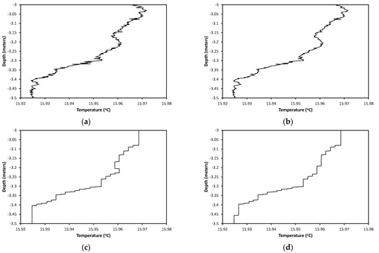 Examples of profile segments illustrating the effects of interpolation to 1 mm vertical spatial resolution and temperature resolution of 3.5 × 10−3 °C: (a) raw profile; (b) spatially interpolated profile; (c) spatially and temperature interpolated profile; (d) Thorpe-ordered version of (c). Profile recorded in Blelham Tarn at 11:00 on 11 August 2008).