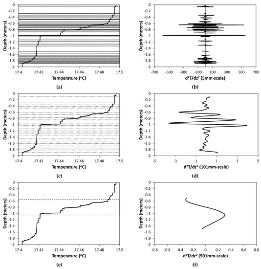 Illustration of the process of calculating the number of layers identified at different spatial scales, by counting turning points (peaks and troughs) in the d2T/dz2 profile: (a) location of layer edges (“shoulders”) at 5 mm scale; (b) d2T/dz2 at 5 mm scale (c) location of layer edges at 101 mm scale; (d) d2T/dz2 at 101 mm scale; (e) location of shoulders at 501 mm scale; (f) d2T/dz2 at 501 mm scale.