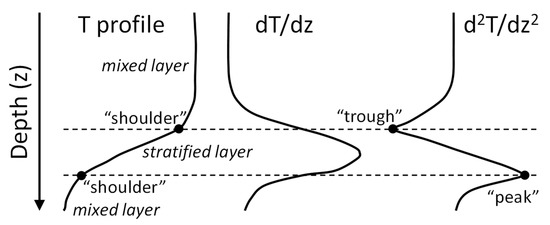Sketch showing how troughs and peaks in the d2T/dz2 profile identify boundaries between alternately (relatively) strongly- and weakly-stratified layers in the temperature profile.