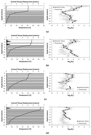 The Batchelor method of calculating KZ was applied to each of the six profiles from each date, using software incorporating this method provided by SCAMP’s manufacturer, PME Inc. Although there has been much discussion of the variability of Rf and Γ in the literature [13,37], the standard approach of assigning a value of Γ = 0.2 was taken. Mean and standard deviation values of KZ were calculated for each 0.5-m depth bin from the surface downwards and plotted against the center point of each bin (0.25 m, 0.75 m etc.). The Thorpe scale method was then used to calculate KZ at every depth (i.e., at millimeter resolution) in the profile using 0.5-m centered windows as described above for LT, calculating the dynamic viscosity, ν, as a function of temperature. Mean and standard deviation values of these Thorpe-scale derived KZ values were then calculated at the same depths used for the Batchelor method (i.e., 0.25 m, 0.75 m etc.).