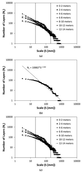 Figure 7a,b show two contrasting examples of layer structure pseudo-spectra, with power law lines fitted, taken from individual depth bins of the same profile (the one taken at 12:28 on 16 June). The equations of the best-fit power law lines are shown on these plots: the power index, which, as explained above, is denoted D (c.f. fractal dimension) is used to quantify the gradient of the dataset. Figure 7c shows the pseudo-spectra from all depth bins of this example profile together. Figure 7a illustrates a fractal structure across all scales (i.e., the gradient is much the same across the whole range of data values), whereas in Figure 7b the fitted power law line digresses strongly from the data, especially at smaller scales. The shapes of these pseudo-spectra are interpreted as follows: where they are steeper, the number of extras layers identified as the scale is reduced is higher, i.e., there is a lot of layering-structure at that particular scale; where they are flatter, there is little layering structure. Thus, in Figure 7b, the flatness of the data at smaller scales (say, <20 mm) implies that there are very few layers smaller than 20 mm in size, i.e., there is very little fine-scale structure in the profile.