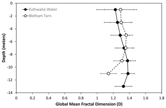To explore the variation of the fractal dimension of the profiles, their variations with depth, between lakes and over seasonal and diel timescales are first considered. Differences in the mean values of D in each 2-m depth bin between the two lakes are shown in Figure 8. The mean values and standard deviations in this plot have been calculated from data from all profiles, thus seasonal variations are both hidden in, and serve to smear out, the standard deviation bars. The value of D peaks deeper in Esthwaite Water than in Blelham Tarn, and is smaller at the bottom of Blelham Tarn than in Esthwaite Water. But overall, both lakes show a similar pattern of lower values at the surface and bottom, and higher values at mid-depths. This suggests an association between less layering structure (lower values of D) and more weakly-stratified and mixed (or mixing) parts of the profiles.