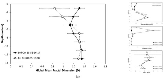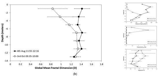 The variation in profiles of D over seasonal and diel timescales is illustrated in Figure 9. Again, the very weakly-stratified, strongly mixing upper part of the 3 October profile is characterised by smaller values of D, indicating less layering structure, while the values of D for 2 October are higher, and those for 4 August are higher still.