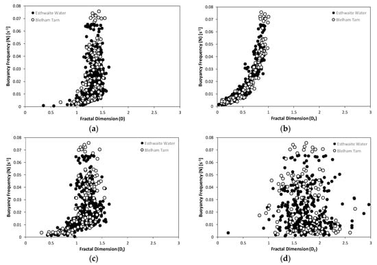 To explore further the way in which D varies, it and its scale-specific forms DF, DI and DC were plotted against the three standard parameters which quantify stratification and mixing—the buoyancy frequency N, the Thorpe scale LT and the coefficient of vertical turbulent diffusivity KZ (using the Thorpe-scale derived version of the last parameter). The relationship between D and N (Figure 10) is not well-fitted by any standard form of regression line but does have very clear limits. There are no cases where D < 1.15 and N > 0.02 s−1, and no cases where N > 0.01 s−1 and D < 1. For D > 1.15, there appears to be no relationship between D and N. The maximum D is approximately 1.55 for all N > 0.01 s−1, whereas for N < 0.01 s−1 it declines sharply with N. Similarly, the minimum D is approximately 1.17 for all N > 0.02 s−1, whereas it declines sharply with N for N < 0.02 s−1. Data from both lakes follow all these patterns in essentially the same way. Amongst the scale-specific versions of D, the relationship with N is strongest for DF, where a very clear relationship is observed, which is best fitted by an exponential regression line (r = 0.902; n = 290; p << 0.001 for Esthwaite Water; r = 0.964; n = 104; p << 0.001 for Blelham Tarn). This association is weaker, but still evident for DI, although the shape of this plot has more in common with that of D than that of DF (i.e., no relationship between DI and N above small values of each parameter, rather than an exponential relationship). The relationship between DC and N appears essentially non-existent. This implies that the layering structure at fine scales (<20 mm) is strongly associated with the buoyancy frequency (which is calculated as an average value for each two-meter depth bin, so can be thought of as a background or ambient value), but that this association weakens as the scale of the layering increases, so that layering structure at scales of >200 mm has no significant association with the background buoyancy frequency.