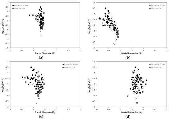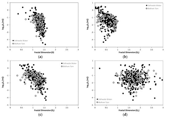 The relationships between D (and its scale-specific variants) and the parameters which quantify turbulent stirring and mixing, LT and (Thorpe scale-derived) KZ show a consistent pattern (Figure 11 and Figure 12). For both lakes, there is a strongly significant negative linear correlation between D and log(LT) (r = −0.533; n = 290; p << 0.001 for Esthwaite Water; r = −0.442; n = 104; p << 0.001 for Blelham Tarn), and D and log(KZ) (r = −0.304; n = 290; p << 0.001 for Esthwaite Water; r = −0.298; n = 104; p = 0.002 for Blelham Tarn), with larger D values (more layering structure) corresponding to smaller LT values and vice versa, but there is also a great deal of scatter around this general trend. Similarly, there is a strongly significant negative linear correlation between D and log(KZ) (r = −0.304; n = 290; p << 0.001 for Esthwaite Water; r = −0.298; n = 104; p = 0.002 for Blelham Tarn), implying that larger values of D are found where there is less turbulent diffusion. For both LT and KZ, the correlation is stronger with DF (particularly for KZ) and DI (particularly for LT) (i.e., at scales < 200 mm). As is the case with N, there is no significant association of LT or KZ with DC. This implies that the active stirring and mixing processes represented in the turbulent overturns in the temperature profiles are most strongly associated with layering structure in the profile at fine and intermediate scales.