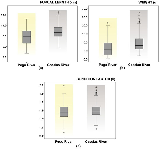 Significant differences were found in the furcal length, weight, and condition factor between the two populations, with the latter being higher in the Caselas River (Table 4, Figure 2).
