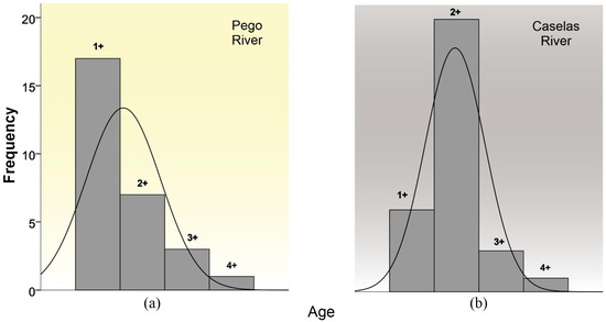 Additionally, the study of the scales allowed to establish five age classes for G. lozanoi. The age distribution in the Pego River corresponds to a well-structured population, while in the Caselas River there is a low survival rate of class 1+ and a clear dominance of adult individuals of class 2+ (Figure 3).