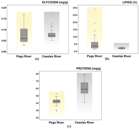 Box plot (median, quartiles, maximum and minimum) of the (a) glycogen, (b) lipids, and (c) proteins values of the individuals of the two studied populations of G. lozanoi.