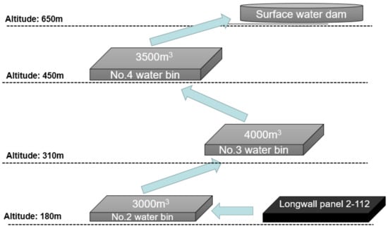 This study is based on the longwall panel 2-112 of Xinzhi coal mine, Huozhou Coal Electricity Group Co., Ltd. The water production rate at the working face is approximately 50 m3/h. Large volume of coal fines are produced during the coal cutting process and coal slurry is generated. Multi-level lifting system is used for the water drainage system. The produced coal mine water is first stored in the No. 2 water bin in the mining area. Then, water is pumped into the No. 3 water bins located at the 310 m level and the No. 4 water bins at the 450 m level, respectively. Lastly, water is pumped from the No. 4 water bins at the 450 m level to the water disposal plant on the surface. Due to the existence of coal fines and particles in the coal mine water, the water lifting cost increases. Meanwhile, it is required to clean the coal sludge at the bottom of the water bins, which would disturb the coal normal production.