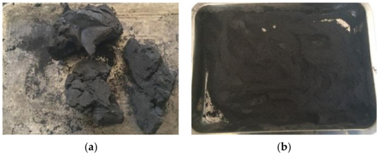 (a) Hardened sludge; (b) coal powders after crushing.
