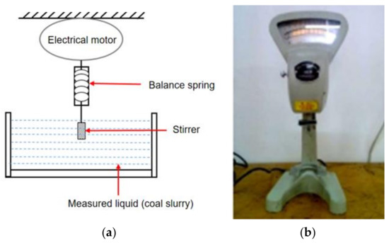 For the slurry viscosity test, the rotation method was adopted. Specifically, a stirrer was placed into the coal slurry and the rotate speed was recorded. Due to the viscous action of the measured liquid, the rotor speed lags behind the initial speed. The relationship between the torque and the viscosity is established. The torque can be measured through the testing rig, so that the viscosity can be calculated. The relationship between the torqued generated by the balance spring and the liquid viscosity can be written as [29,30]: