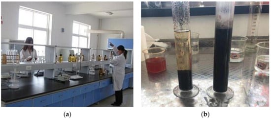 Laboratory testing of coal mine water quality. (a) Sample preparation; (b) after testing.