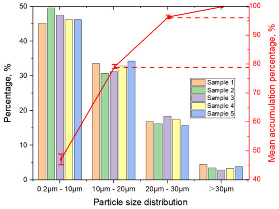 Figure 6 shows the coal powders size distribution. A total of five samples were tested and the particles are divided into four groups: 0.2–10 μm, 10–20 μm, 20–30 μm and >30 μm. It can be seen that more than 40% of the coal powders are smaller than 10 μm. The percentage of >30 μm is less than 5%. From the accumulation perspective, almost 80% of the powders are smaller than 20 μm. It can be concluded that the coal powders are very fine, compared with the coal powders of coal wash plant. Based on the size distribution, the vibrating sieving machine can be selected.
