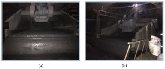 The GPS1837 vibrating sieve in the tailgate of the longwall panel. (a) Front view; (b) side view.
