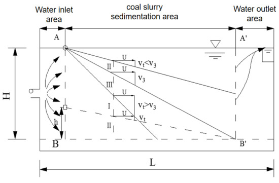 where is the water horizontal velocity, is the depth of the settling pond, is the length of the coal slurry sedimentation area, is the width of the settling pond, is the water flow volume through the section face, is the surface area of the settling pond, is the surface loading and its value equals to the critical vertical velocity.