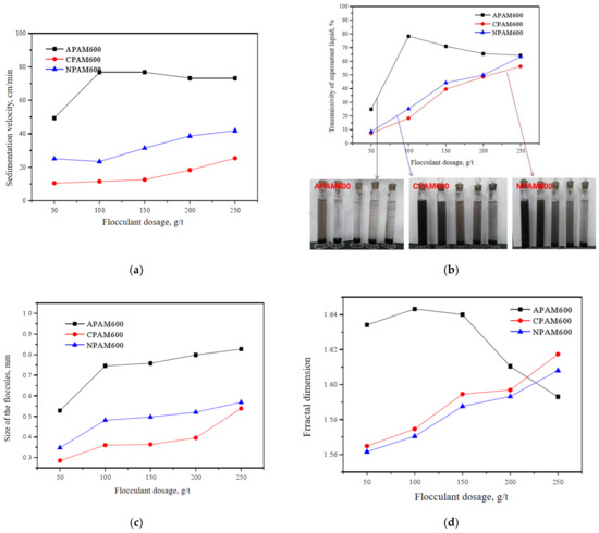 From the size of the floccule aspect, as shown in Figure 10c, the APAM600 has the largest size of the floccule, ranging from 0.5 to 0.8 mm, when the dosage increases from 50 to 250 g/t. The total trends are similar to that of the sedimentation velocity. Fractural dimension is one index to evaluate the compaction of the floccule. The floccules would be attached with each other. More floccules are attached with each other, the higher value of the fractural dimension is. That means the performance of the flocculant is good. From Figure 10d, it can be seen that the highest fractural dimension is 1.65 when the flocculant is APAM600 and the dosage is 100 g/t.