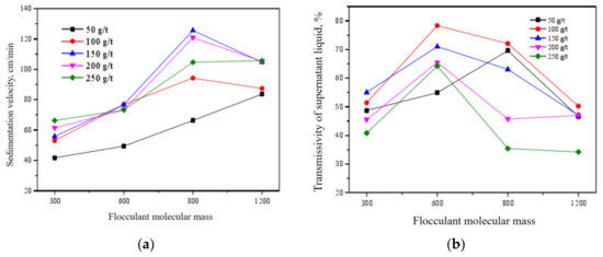 Testing results of different flocculant molecular mass. (a) Sedimentation velocity; (b) transmissivity of supernatant liquid.