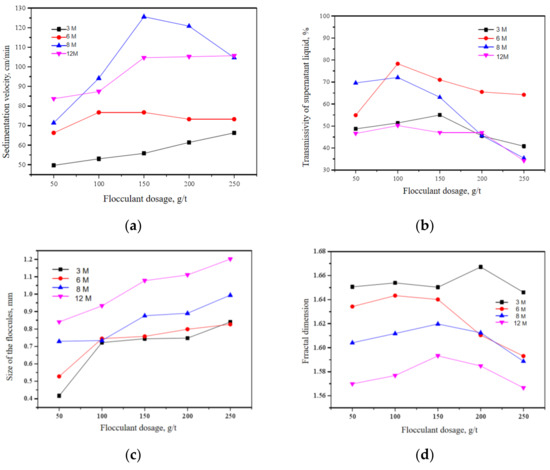 In this section, we tested the sedimentation results of different molecule mass, with respect to different dosage. The sedimentation velocity, transmissivity of the supernatant liquid, size of the flocculate and fractural dimension are compared and shown in Figure 12. When the molecular weight was small, the settling velocity increased gradually with the increase of dosage. When the molecular weight was large, the settling velocity and showed a trend of first increasing and then decreasing. The transmission ratio of supernatant reached the maximum when the dosage was small, and continued addition of dosage would lead to a significant decrease in the transmission ratio of supernatant. When the molecule mass of the anionic flocculant was 3 million, with the dosage of flocculant increased from 50 to 250 g/t, the sedimentation velocity increased from 49.70 cm/min to 66.27 cm/min, and the transmission ratio of supernatant reached the maximum 55.0% at 150 g/t dosage. The sedimentation effect of 8 million showed the most obvious trend with the increase of dosage. When the dosage of flocculant changed from 50 to 150 g/t, the sedimentation velocity increased from 71.39 cm/min to 125.57 cm/min and then decreased to 104.64 cm/min. The transmission ratio of supernatant reached the maximum value of 72.1% at a small dosage of 150 g/t. For anionic flocculants with different molecular masses, the fractal dimension first increases to a maximum value and then decreases gradually with the increase of dosage of flocculant. This reflects a process of floc change with the increase of drug dosage. With the increase of dosage, the particle size of flocs becomes larger and the sedimentation velocity increases gradually. However, particle size is not only the main factor affecting the settlement velocity after reaching a certain extent. The internal compactness of flocs also affects the sedimentation process, and the fractal dimension changes from increasing to decreasing. At this time, the density of flocs decreases, which is macroscopically manifested as a slight decrease in sedimentation velocity and a decrease in the transmission ratio of supernatant.