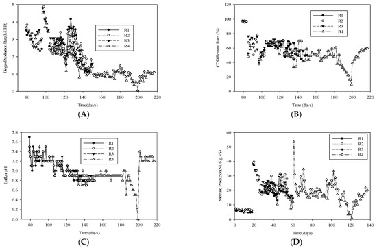 Changes in bioreactor performance over time during the operating period including the following parameters: (A) biogas production; (B) COD removal rate; (C) effluent pH; (D) methane production.