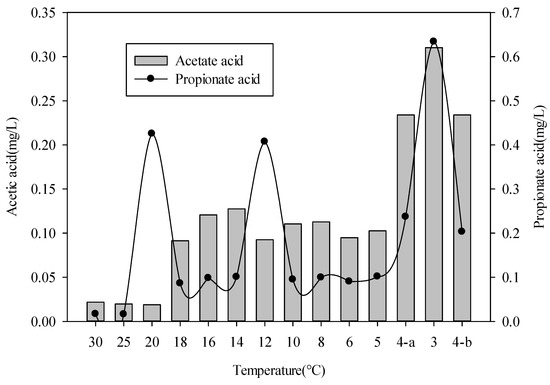 Temperature-dependent changes in effluent volatile fatty acids, including acetic acid and propionate acid. 4-a: Operating temperature of the reactor before the medium soured; 4-b: Recovery at 4 °C after the reactor medium soured.