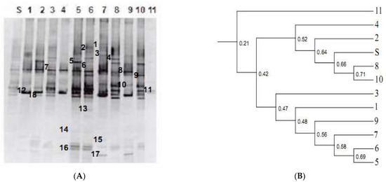 Denaturing gradient gel electrophoresis (DGGE) showing changes in the archaea population in the fixed-bed reactors. (A) Archaea bands; (B) Systematic trees from DGGE band analysis. S: seed sludge sample; 1, 3, 5, 7, 9: adherent sludge at 18 °C, 10 °C, 8 °C, 6 °C, and 4 °C; 2, 4, 6, 8, 10, 11: deposition sludge at 18 °C, 10 °C, 8 °C, 6 °C, 4 °C, and 3 °C.