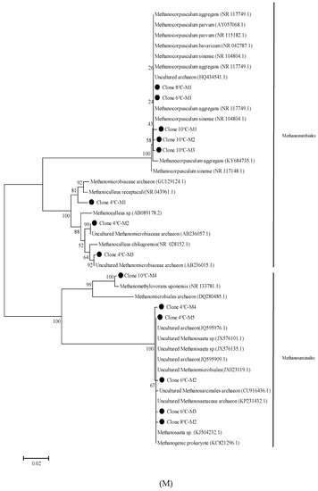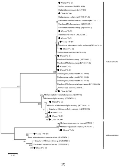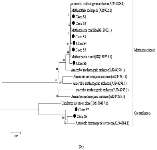 The following PCR primers for archaeal communities were used: A109f (5′-ACKGC TCAGTAACACGT-3′) and A912r (5′-GTGCTCCCCCGCCAATTCCTTTA-3′) [26]. After purification (TIANgel Midi Purification Kit, Tiangen Biotech, Beijing, China), PCR products were inserted into the pGEM-T Easy Vector (Promega, Madison, WI, USA) according to the manufacturer’s directions. A total of 192 colonies were obtained; 50 colonies were randomly chosen for sequence analysis. Each clone resulted in a single band with a distinctive melting position. Sequence similarity was determined based on the BLAST database from Genbank (http://www.ncbi.nlm.nih.gov/BLAST/ accessed on 27 September 2020). A phylogenetic tree was created using CLUSTAL X and MEGA 4.0 software by employing the neighbor-joining method [27,28].