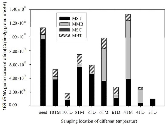Quantitative alterations in the methanogenic community composition of the deposited sludge and the carbon-fiber carrier at 10 °C, 8 °C, 6 °C, 4 °C, and 3 °C were determined using real-time PCR (Figure 6). The predominant species in the seed sludge was methanosaetaceae, which accounted for 85.28% of the methanogens (sum of the concentrations of all quantified 16S rRNA genes). This finding is consistent with the results of our clonal analysis, as well as published reports showing abundant methanosaetaceae-related species in stable granular anaerobic digesters [9,18].