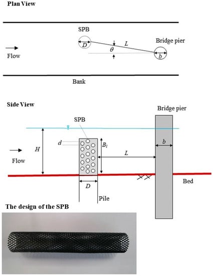 - SPB setup factors: basket diameter , basket shape factor Kl, basket length Bl, distance from the protected pier L, hole size d, attack angle of approach flow , and porosity e.