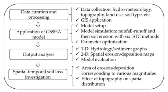 The schematic diagram of the study is illustrated in Figure 1 and the structure of the paper is designed as follows. Section 2 provides general information about the study site and input data. Methodologies of 6 STC methods and model description/setup are presented in Section 3. Rainfall-runoff-sediment evaluations, the spatial distribution of soil erosion/deposition, and the effect of topography on spatial distribution are visualized and analyzed in Section 4, followed by summarized conclusions in Section 5.