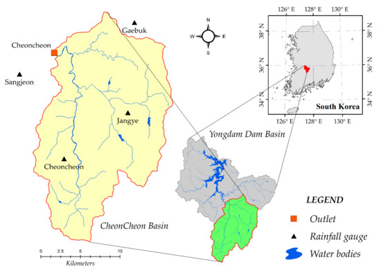 - K-Water. Hydrological Investigation Report of Yongdam Dam Basin; Korean Water and Wastewater Association: Seoul, Korea, 2002. [Google Scholar]