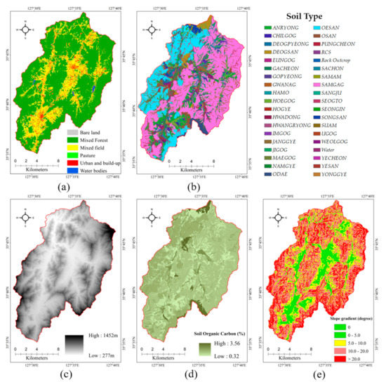(a) Land use type; (b) Soil type; (c) DEM; (d) Soil organic carbon; (e) Slope gradient.
