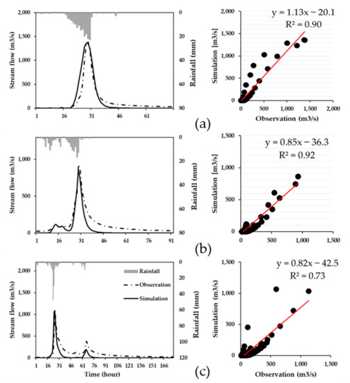 Flow discharge predicted by the GSSHA model in Event 1 (a), Event 2 (b), and Event 3 (c). The scatter plots (and values) represent a 1:1 comparison between the prediction (y-axis) and the observation (x-axis), and the black lines denote the stream discharge.