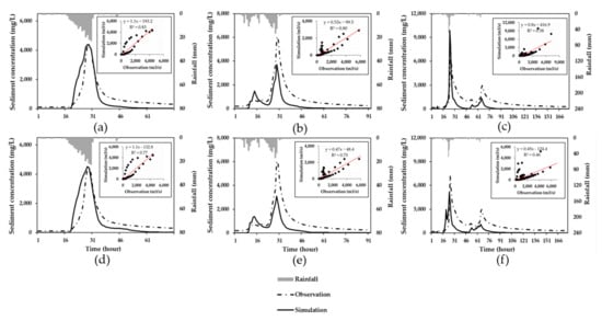 Comparison between simulation and observation of sediment concentrations in Cheoncheon basin with the KR method in Event 1 (a), Event 2 (b), and Event 3 (c); with the EH method in Event 1 (d), Event 2 (e), and Event 3 (f).