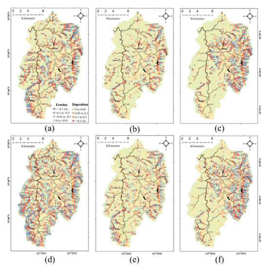 Spatial-temporal distribution of erosion/deposition maps predicted by the KR method in Event 1 (a), Event 2 (b), and Event 3 (c); and by the EH method in Event 1 (d), Event 2 (e), and Event 3 (f).