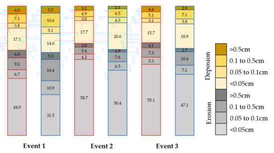 Overall, erosion is more prevalent than deposition, which only accounted for approximately one-third of the basin area shown in the stacked column charts (Figure 7). In Event 1, the percentage of soil erosion simulated by the KR method was 66.0% (approximately 174.1 km2). After 5 years, this percentage increased to 71.8% (approximately 208.9 km2). This assumedly climate-change-related trend [67,68] has also been validated by results produced by the EH method. The values are 64.1% and 67.3%, respectively. The percentage of basin area that impacts soil erosion with magnitude ranging from 0.0 to 0.05 cm is approximately 30–60%. The values for soil deposition are lower, approximately 15–20%. Both soil erosion and deposition with a magnitude higher than 0.5 cm only account for less than 10% of the basin area. This concluded that the soil loss in the Cheoncheon basin is mild and in compromise with previous results of Yu et al. [69]. Since the Cheoncheon watershed was mainly covered by forests (approximately 63%), the rainfall kinetic energy rainfall impacts could be partly precluded by the canopy from directly contacting the land surface [70], and this may reduce the magnitude of soil erosion. The proportions of erosion in 2002 and 2007 were 64.1% and 67.3%, respectively.