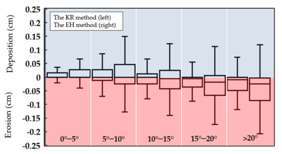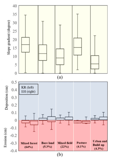 Figure 9 reveals the relationship between land-use type and slope gradient. Locations of forest and pasture higher than the remaining land-use type were more strongly related to soil erosion. The box-whisker plots also show that the EH method had a higher influence on topography than the KR method in soil loss spatial distribution, even though both methods had the same results in sediment concentration prediction.