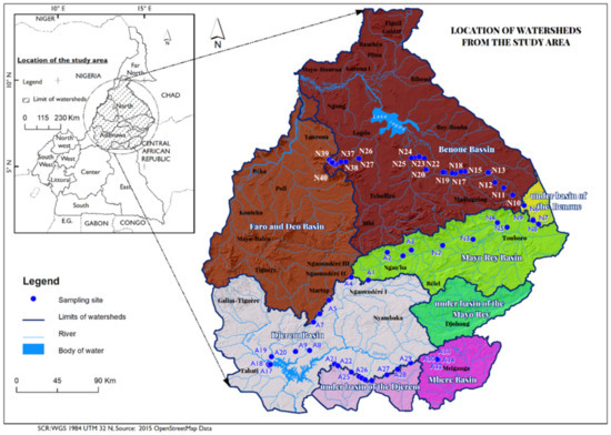 The study area consists of the first-largest river (Sanaga basin, 133,000 km2) [23] and the second-largest river (Benue basin, 75,000 km2) in Cameroon, subdivided into the five watersheds. It is in the R-NO and R-AD, which share Mayo-Rey and Faro-et-Déo basins. These basins, together with the Benue basin in the R-NO, are found between latitudes 7°60′–8°53′ N and longitudes 13°21′–15°29′ E° (Figure 1). Meanwhile, in the R-AD, added to the Djérem and Mbéré, the basins extend between latitudes 6°30′–7°58′ N and longitudes 12°60′–14°29′ E° (Figure 1). Moreover, the southern Lake Chad watershed merges with the Mbéré basin at the Cameroon–Central African Republic border, 314 km from the source [24].