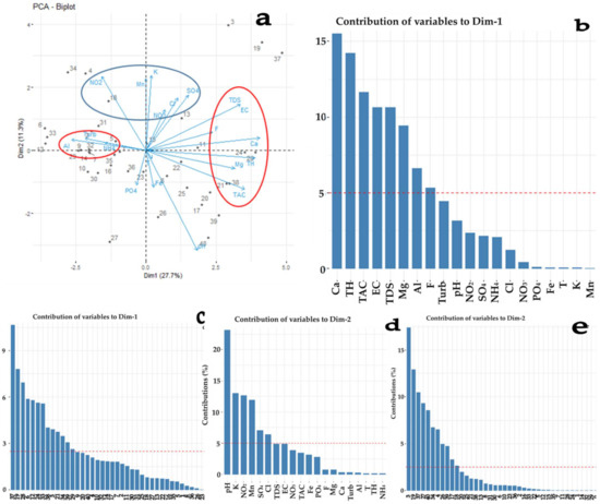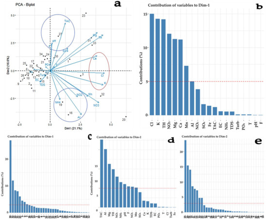 Bi−plot for the general variation of variables and individuals (a) and their respective contributions (b–e) within watersheds studied in the R-AD.
