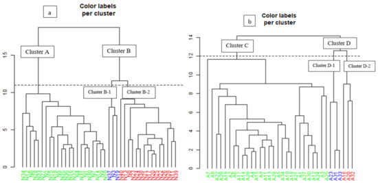Dendrogram of hierarchical cluster analysis based on water points within watersheds in the R-NO (a) and in R-AD (b).