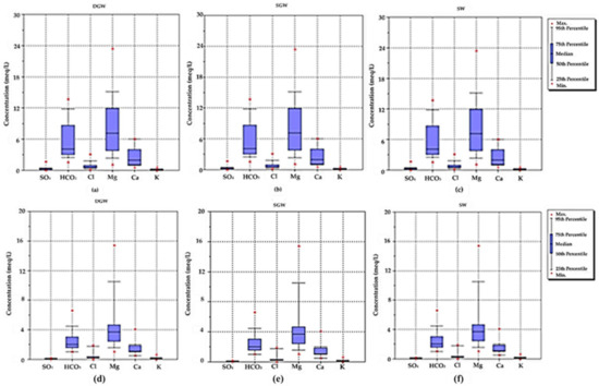 Box-whisker was represented to identify the predominant cations and anions. The major ion concentrations in meq/L of DGW, SGW, and SW within watersheds in the R-NO and R-AD were in the following order for cations Mg2+ >Ca2+ > K+ and for anions HCO3− > Cl− > SO42− (Figure 5).